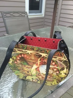 I make these handbags from mostly my personal vinyl record collection, however, some records were brought to me from their collection. I use the cover and one side of the record and combine interior layer with different designs, and than wrap in leather around sides and ad straps.